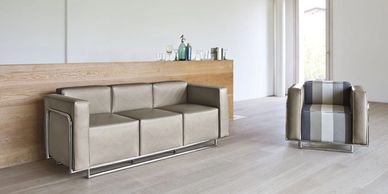 Built of wood with arm inserts and legs in a chrome or anthracite metal finish. Available as an armchair or as a two- or three-seat sofa.