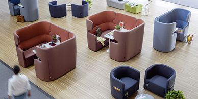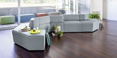 A collection of armchairs, sofas and benches with soft lines for a comfortable wait.
